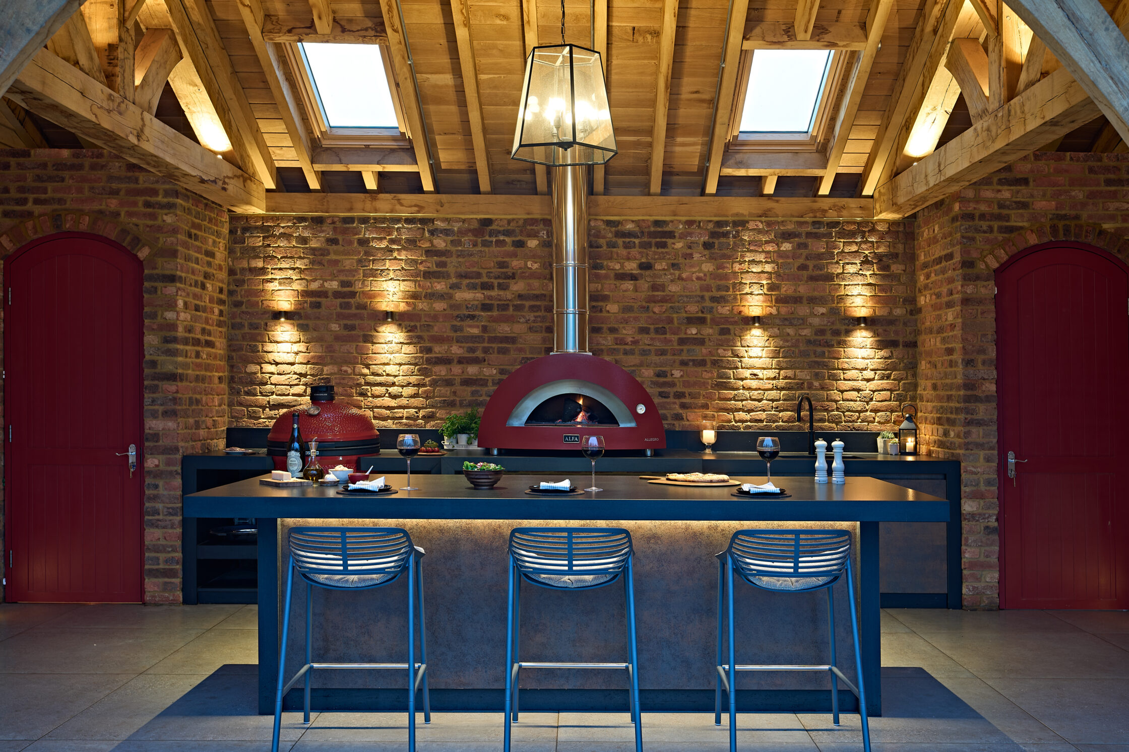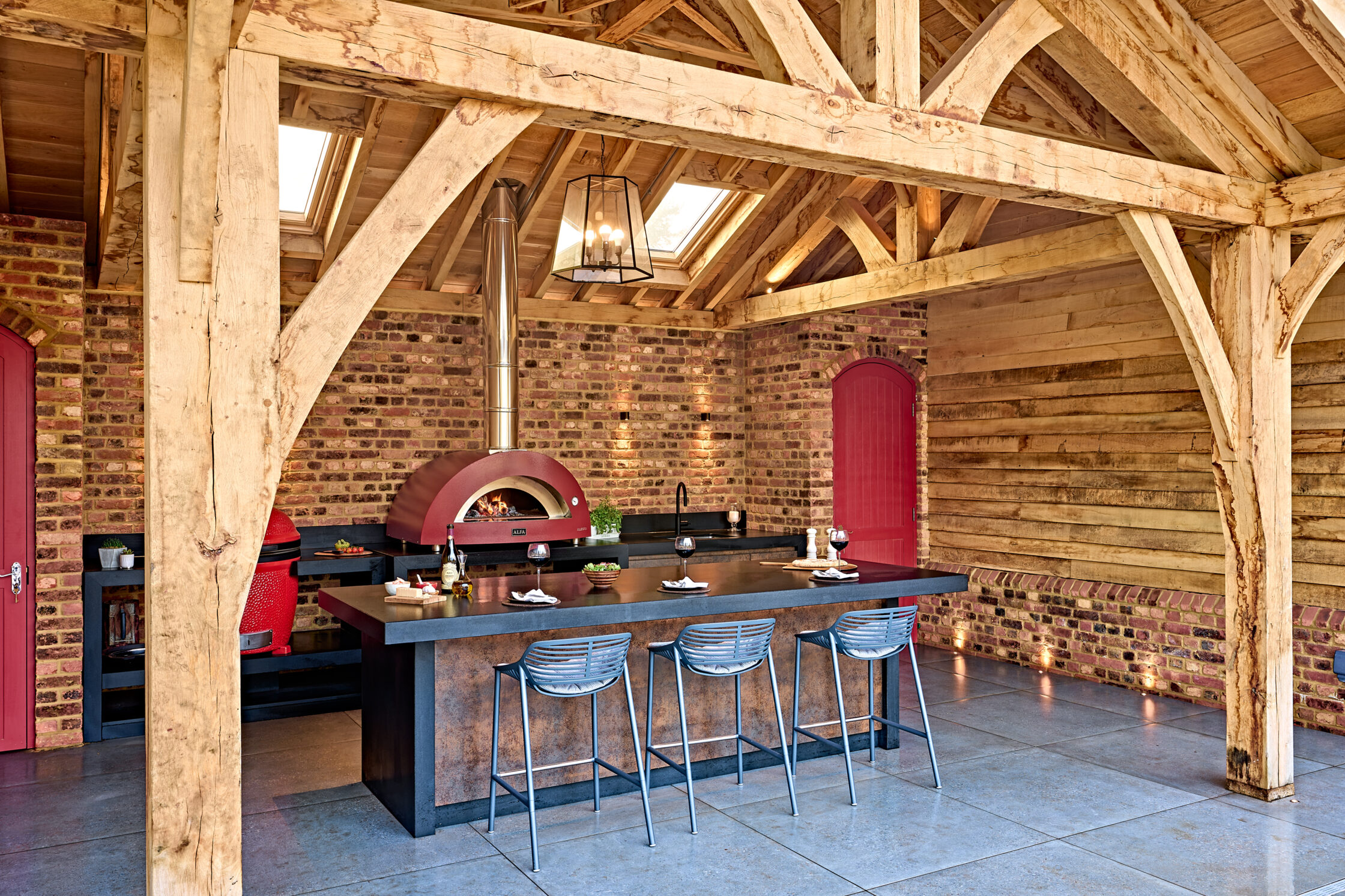 This stunning outdoor space was designed by Kevin Stevens of Stevens Design Refurbishment & Build. The clients wanted to transform the outside space into an “entertaining haven” as they love to cook and spend time with friends and family – outside. Nestled under a timber bridging roof between two outbuildings is where you will find the outdoor kitchen hub.
