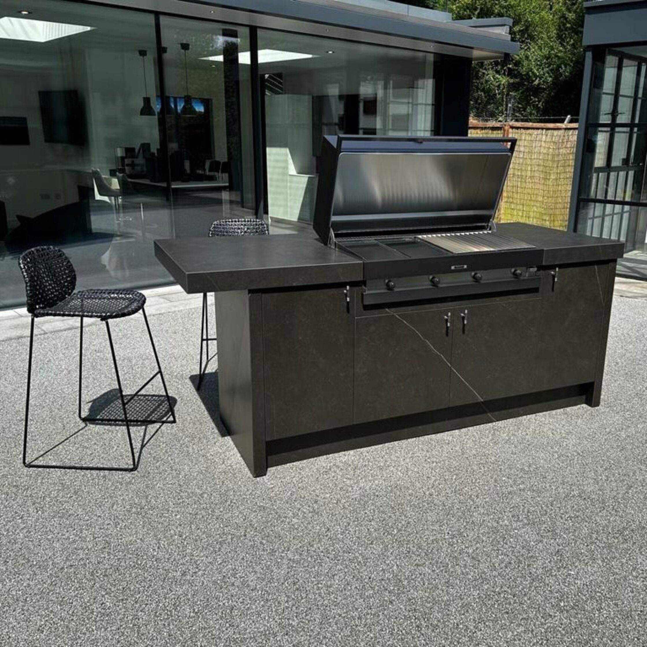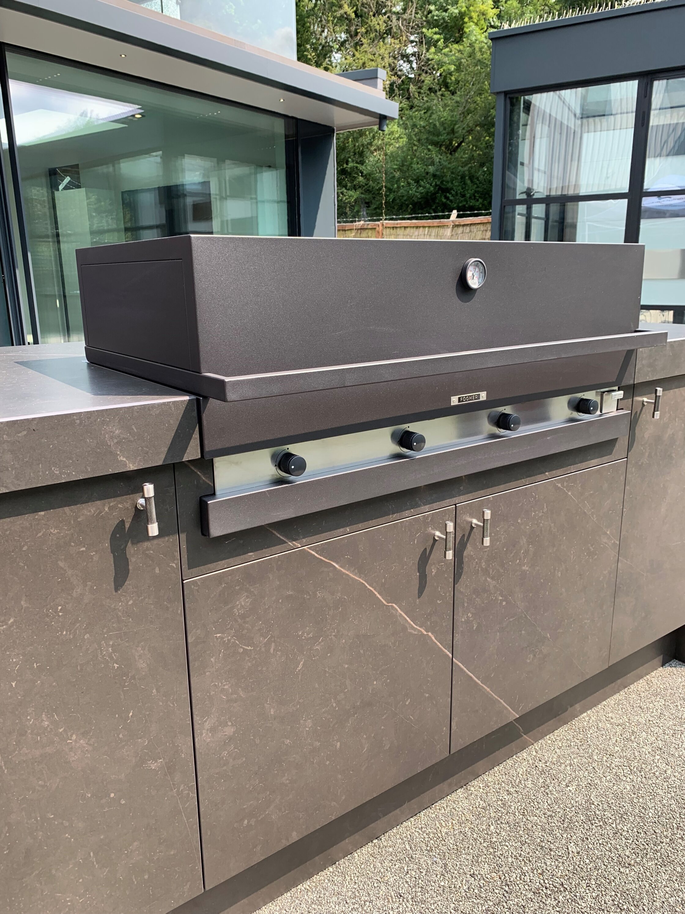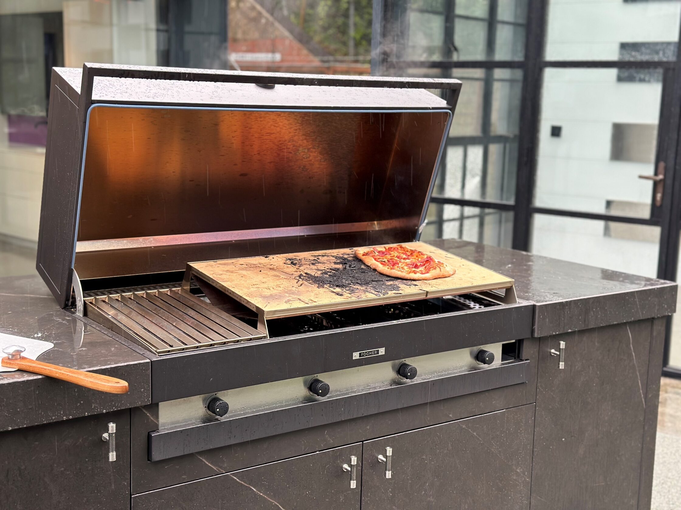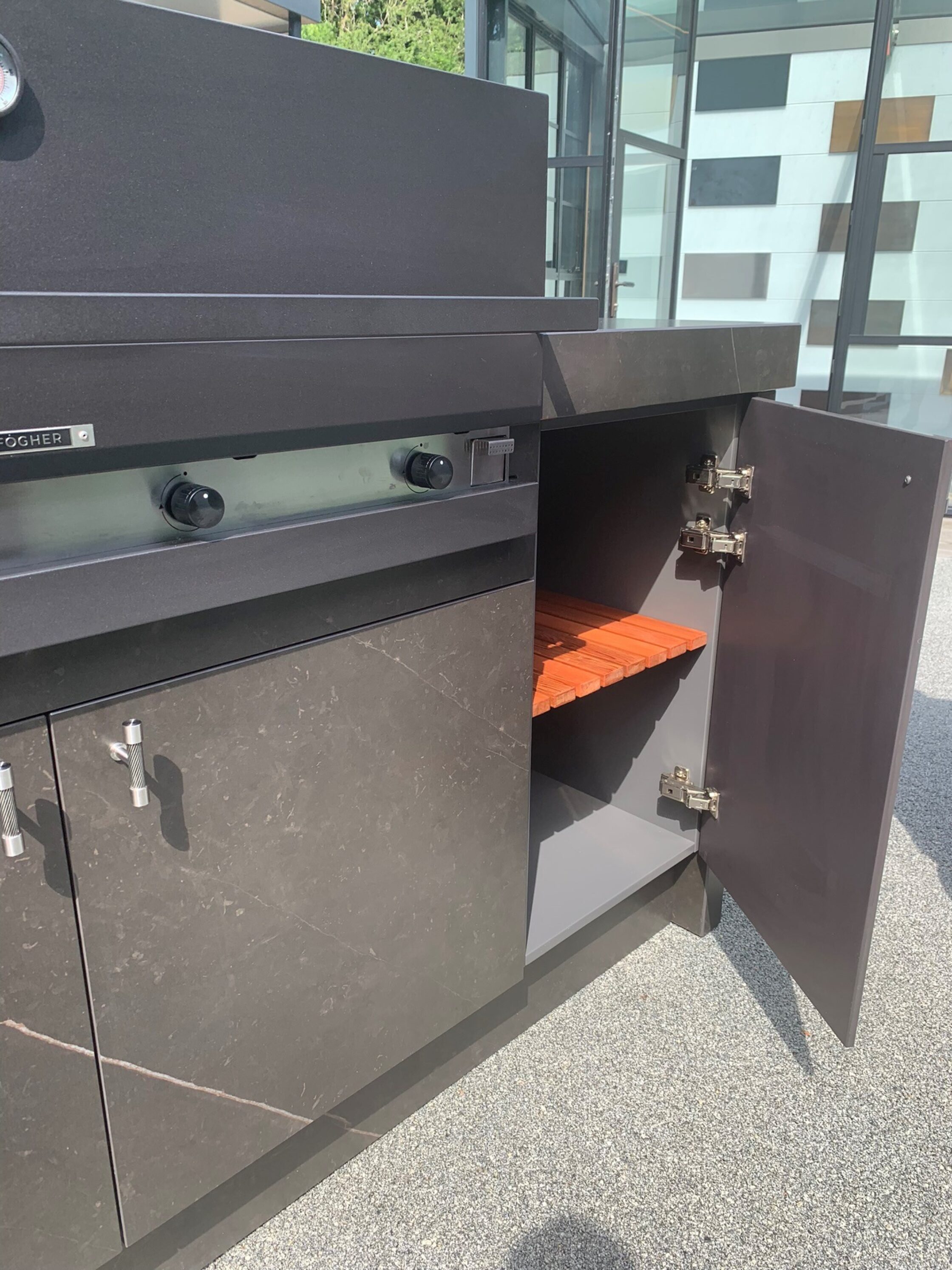 The built-in grill is the Fogher FGA 1000 which features a sleek black exterior made from painted aluminised sheet metal over a central core of stainless steel. Additional accessories compatible with the high lid version of this grill allow you to create a multitude of dishes including a baking kit for pizza and bread, soapstone for delicate meat, fish and vegetables and smoker kit for lower temperature cooking over wood chips.