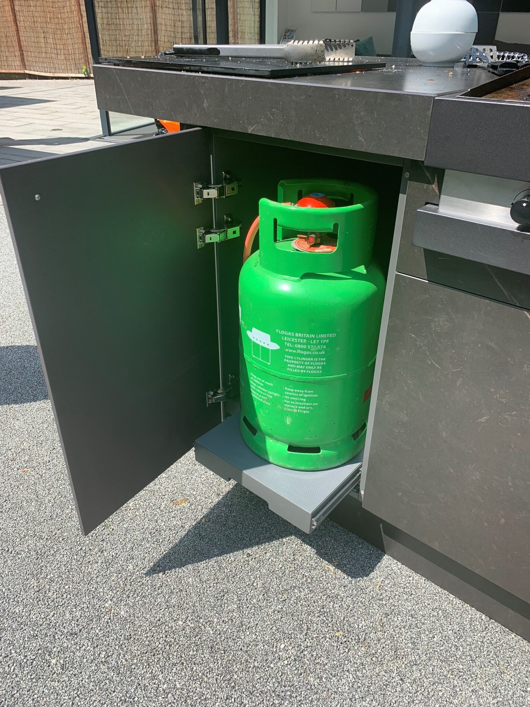 The worktop along one side and the back of the island has been extended to create a bar-style seating area and internally the cupboards feature a slide-out gas bottle ledge and cedar wood shelving.