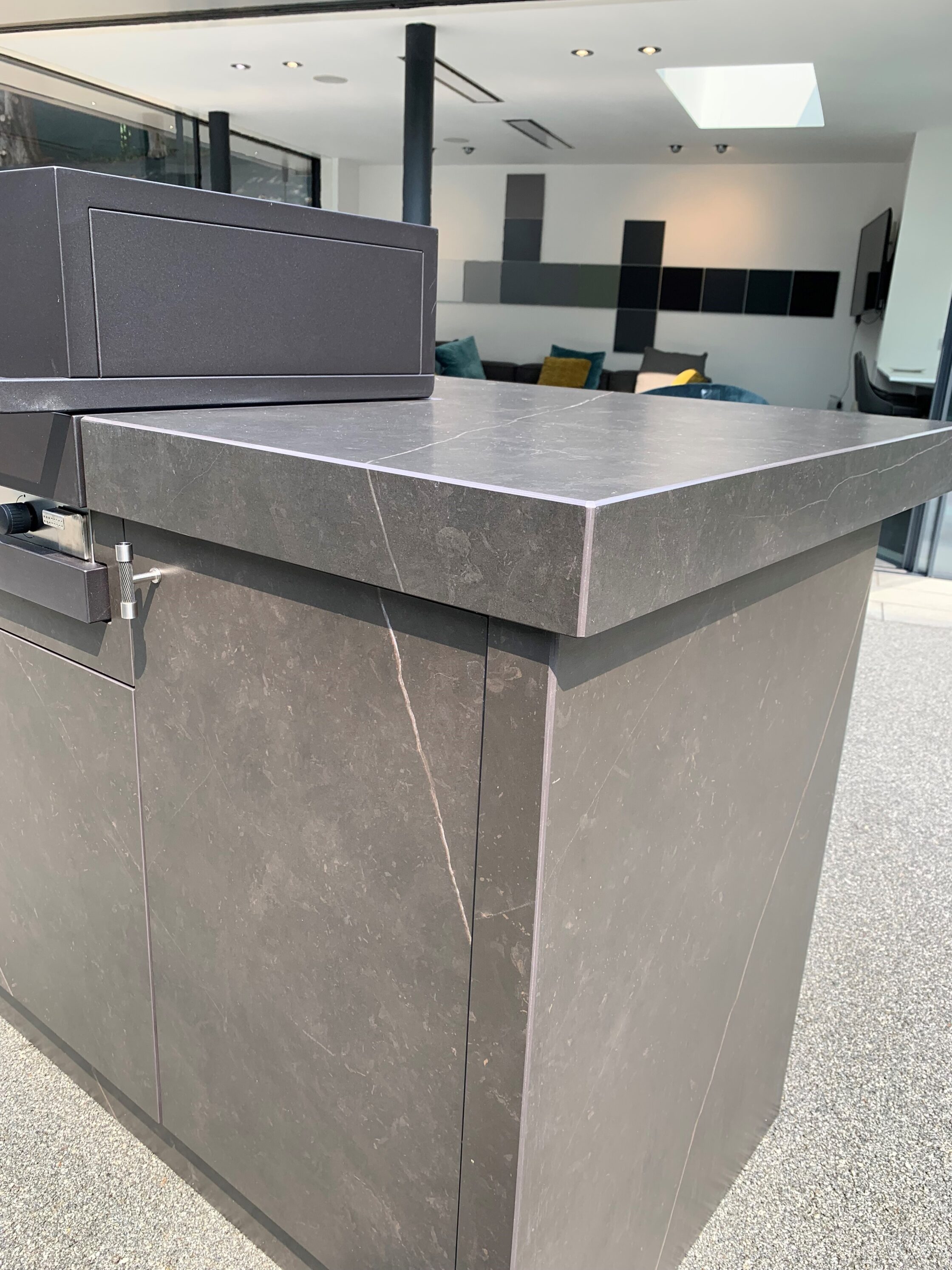 The worktop, door fronts and cladding are made from Neoltih Calatorao, a marble-inspired sintered stone surface with a dark fossilized background and white and gold veins.