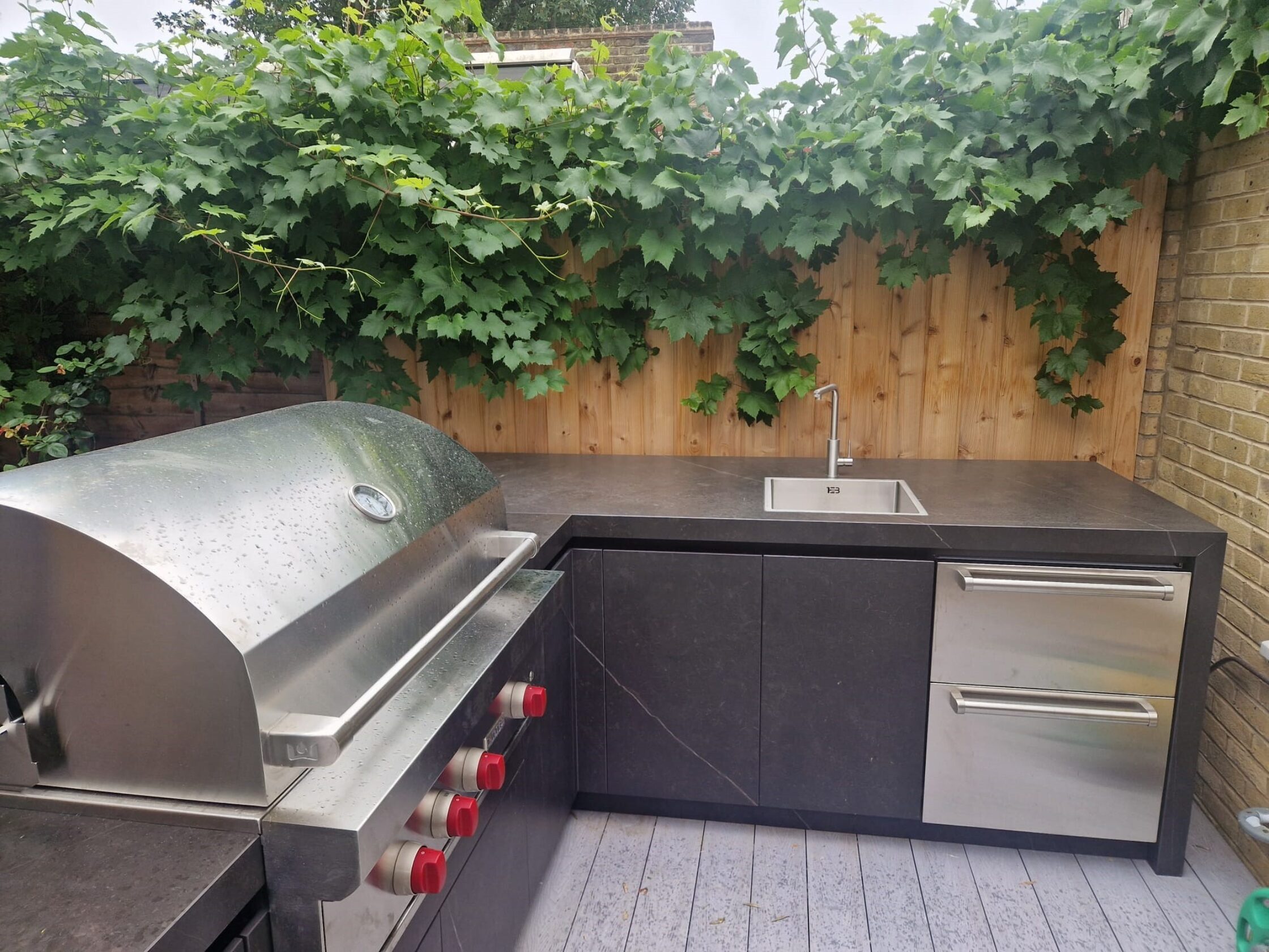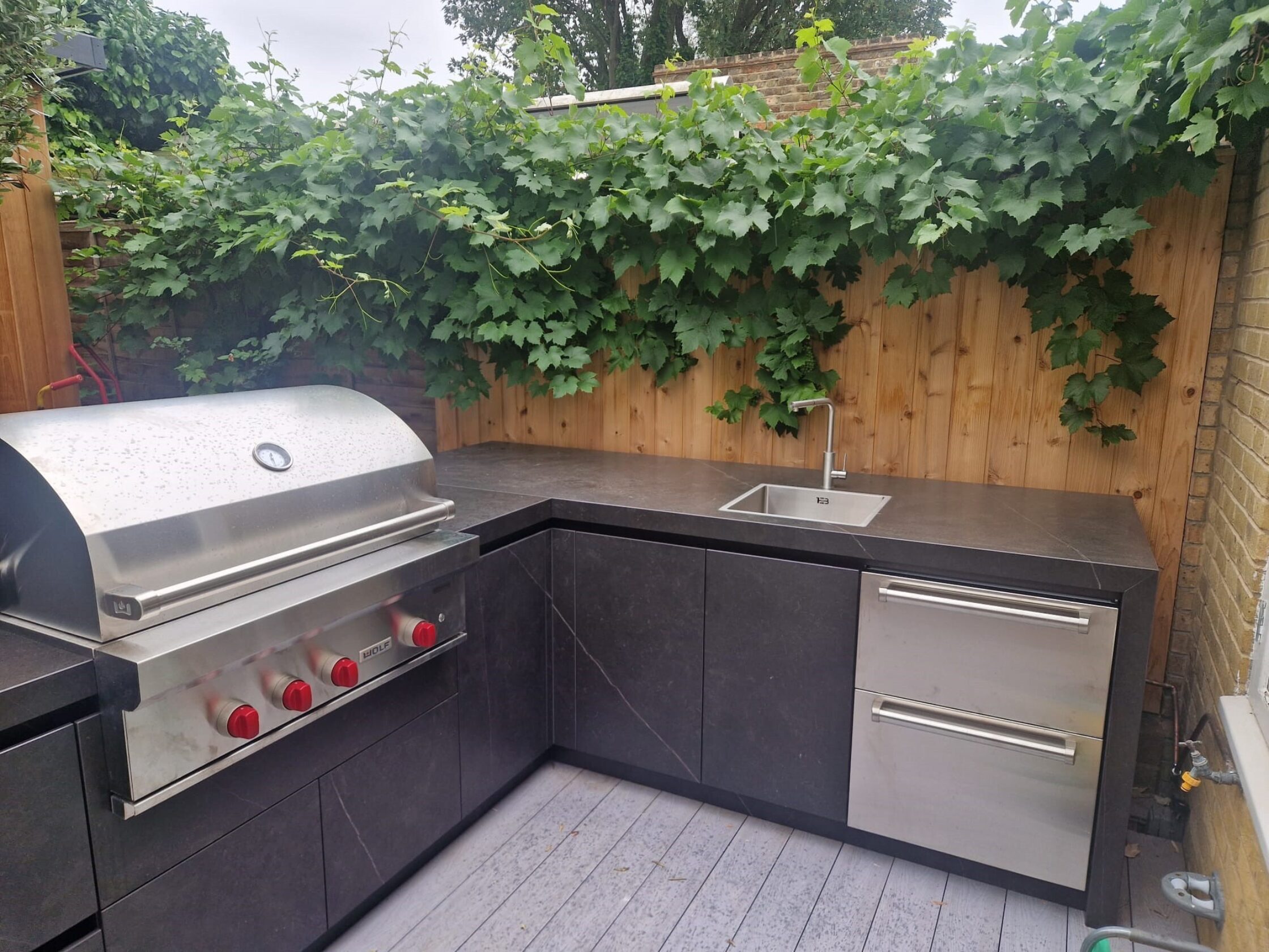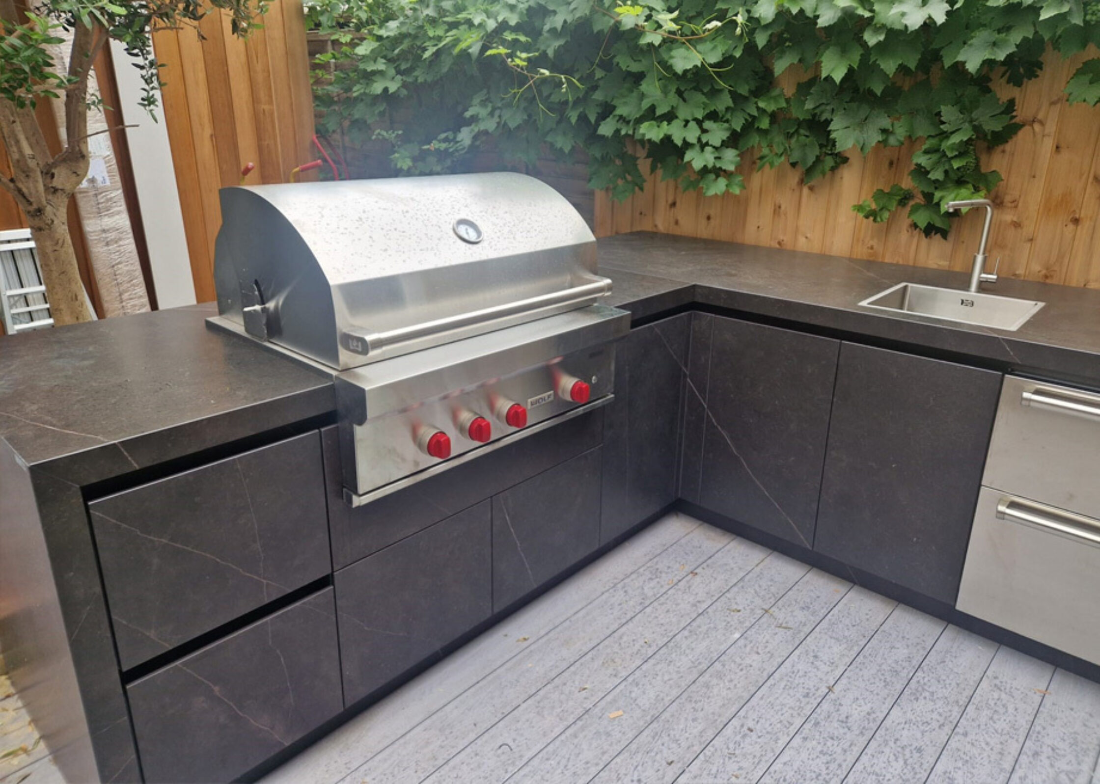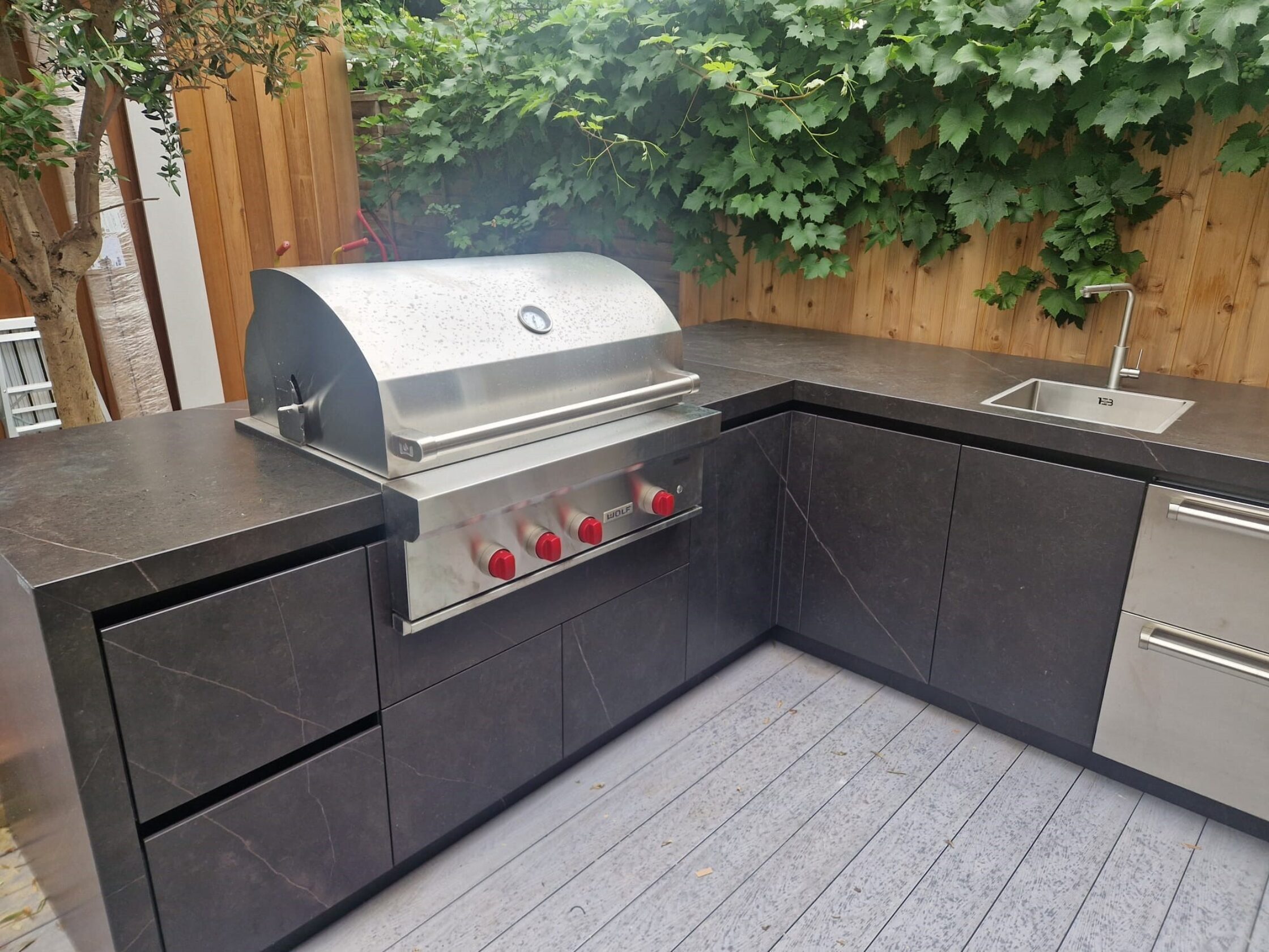 This stylish L-shaped handleless KonigOutdoor features a sleek design with premium appliances, designed by Espresso Design.