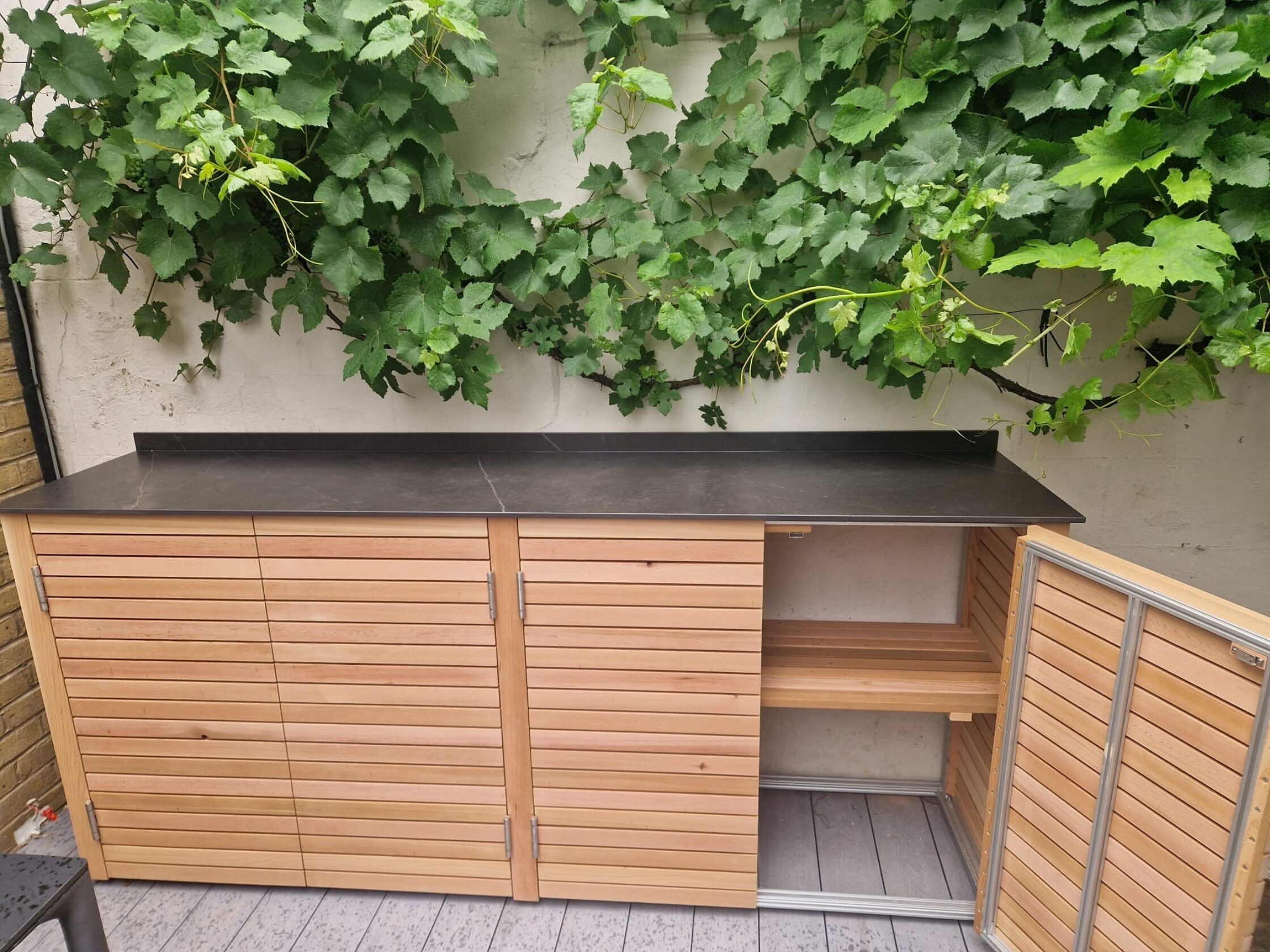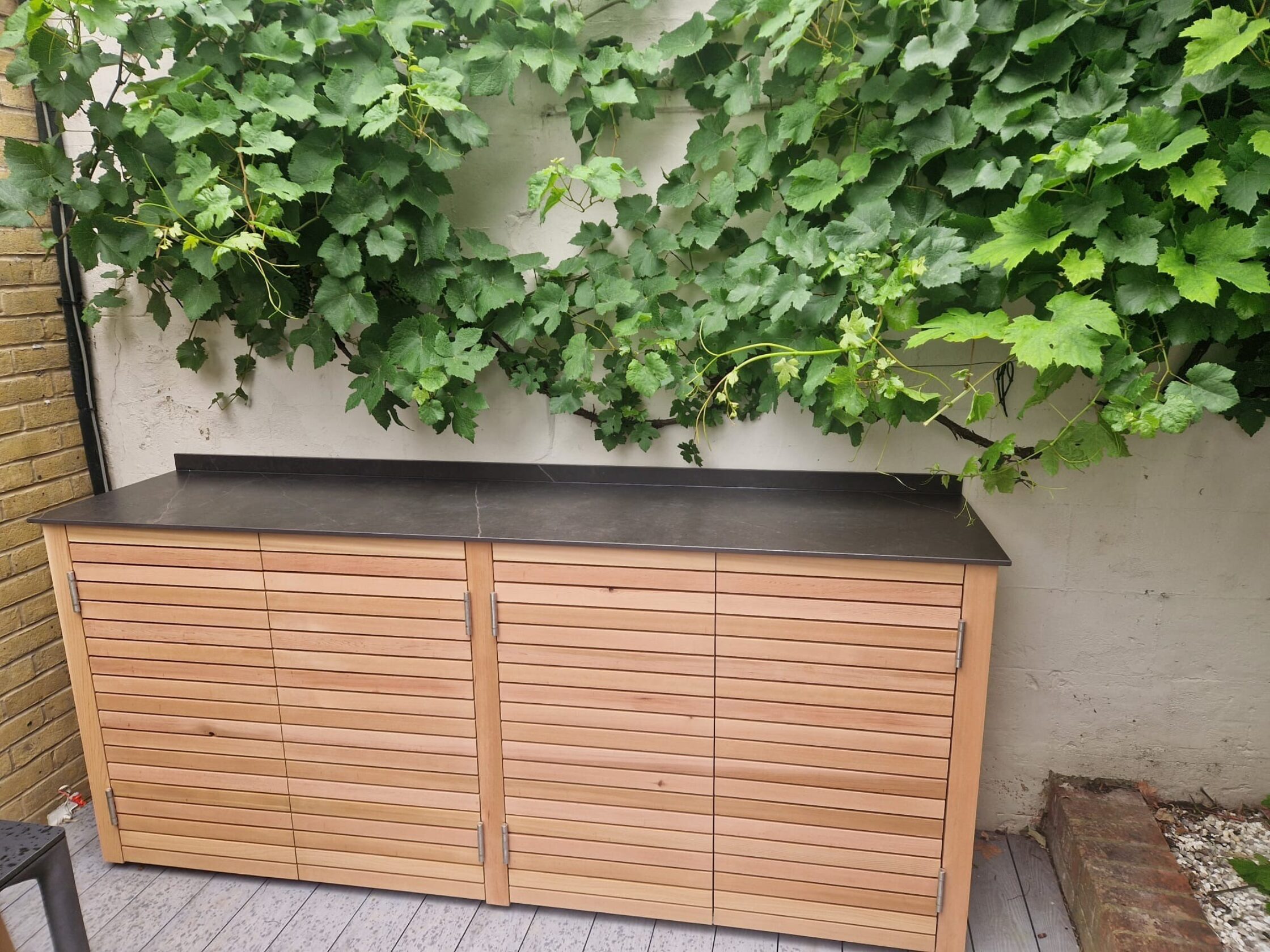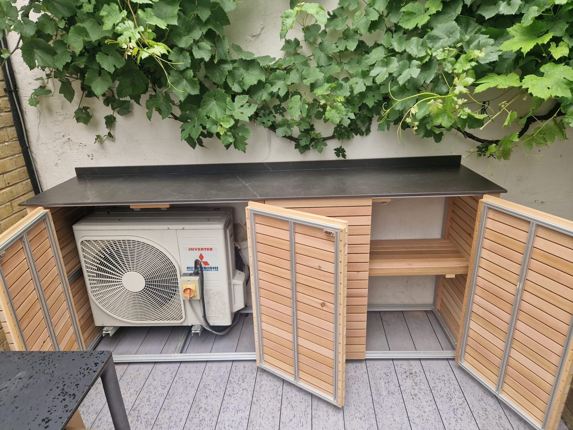 We also crafted a cedar wood unit with matching 12mm Calatorao worktop to stylishly house an air conditioning unit and provide additional storage.