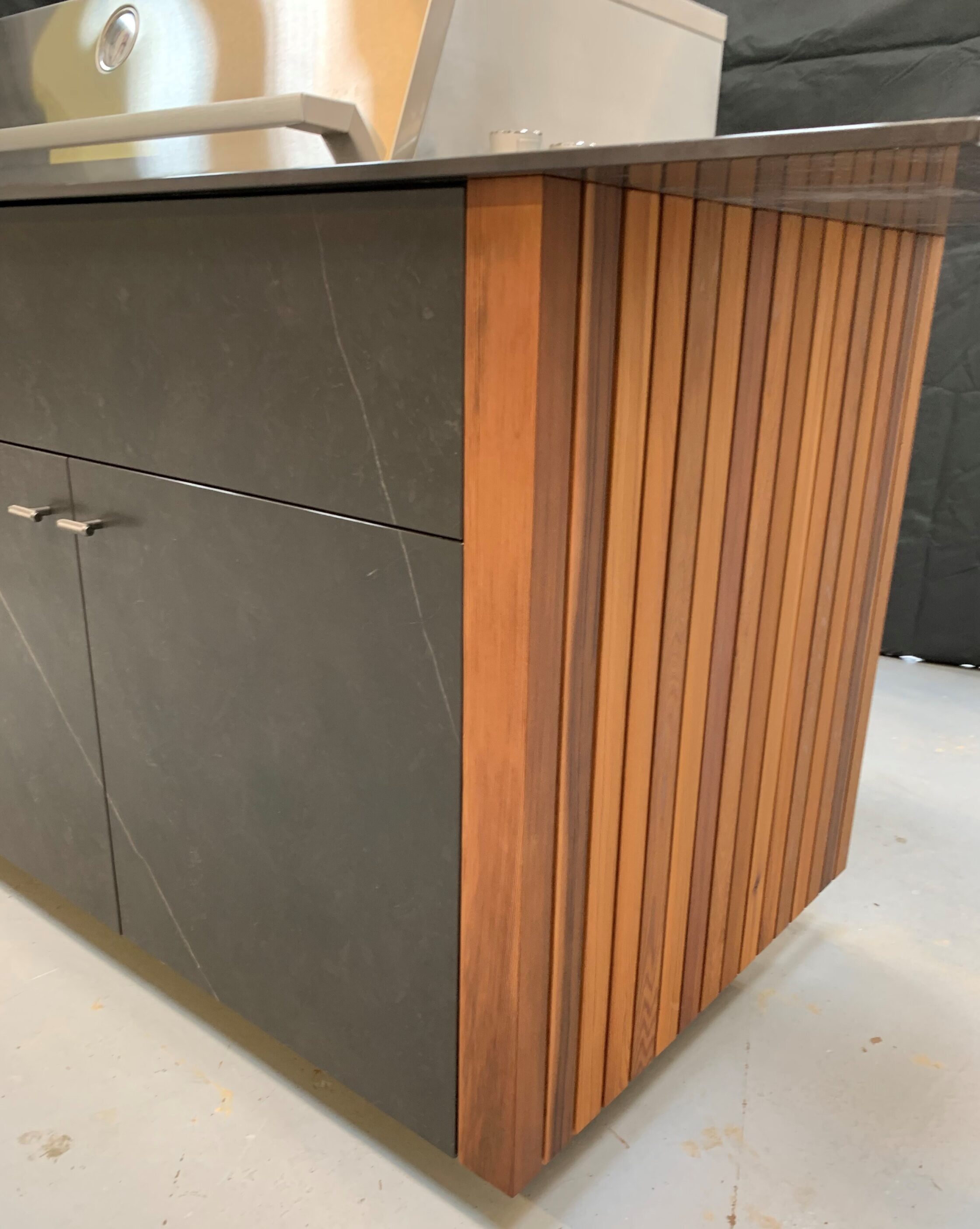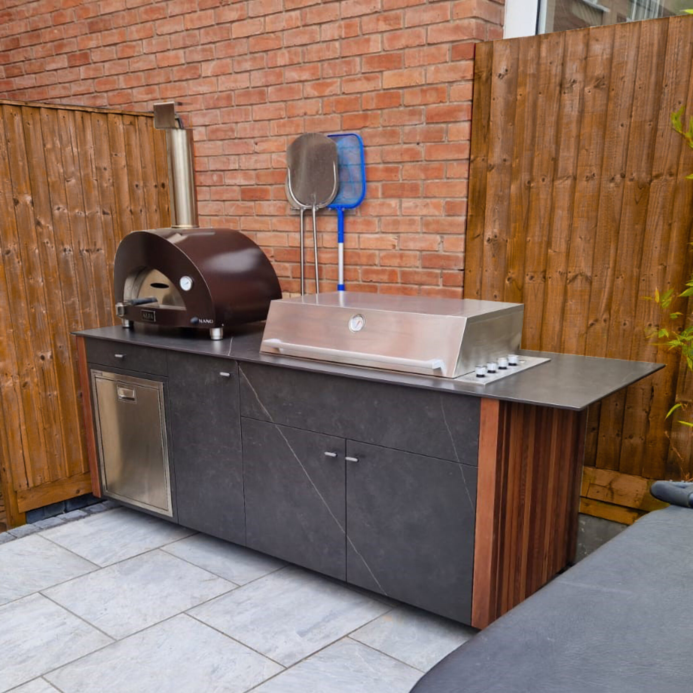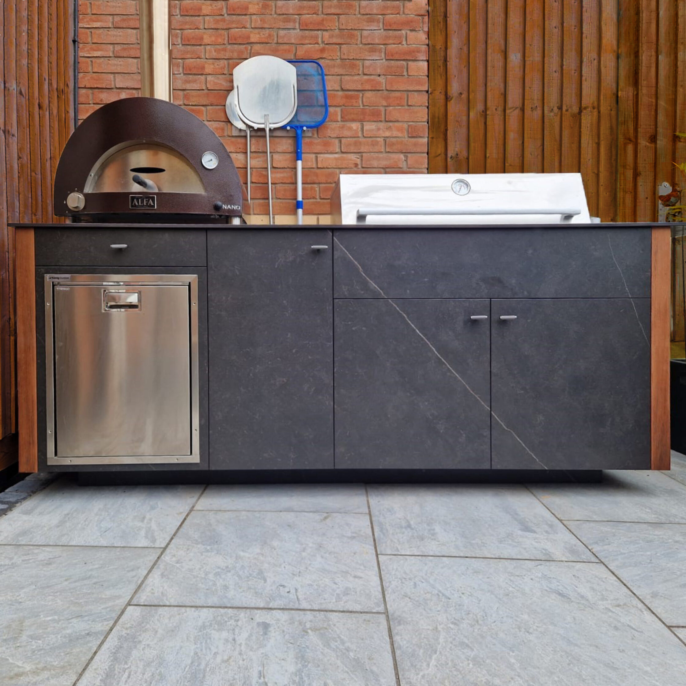 The built-in grill is the Beefeater Proline with roasting lid, featuring a sleek linear design, 303 stainless steel and 6 burners. The pizza oven is the Alfa Forni Nano Wood Fired Oven which goes from 0 to 500°C in just 10 minutes and cooks a pizza in 90 seconds.