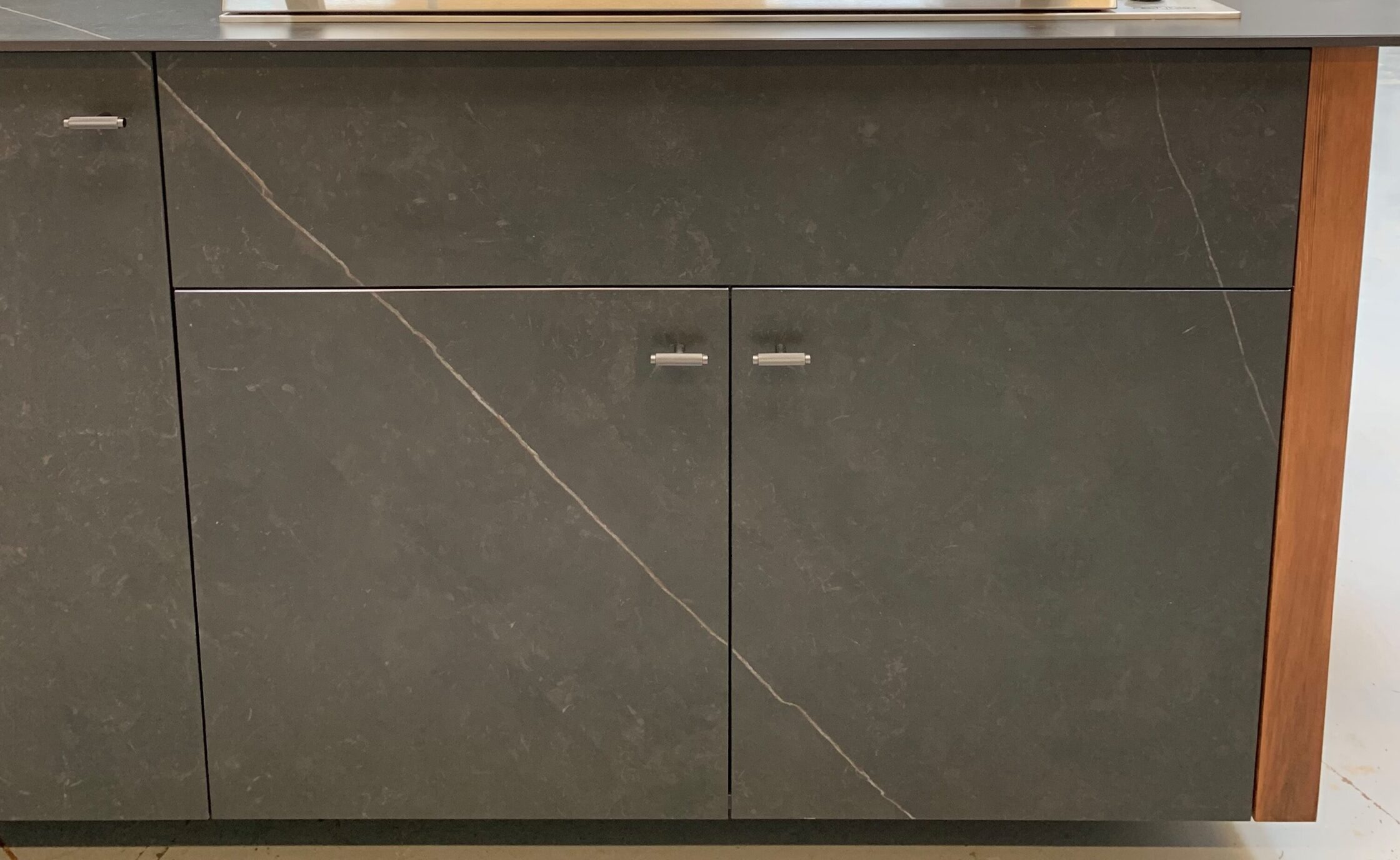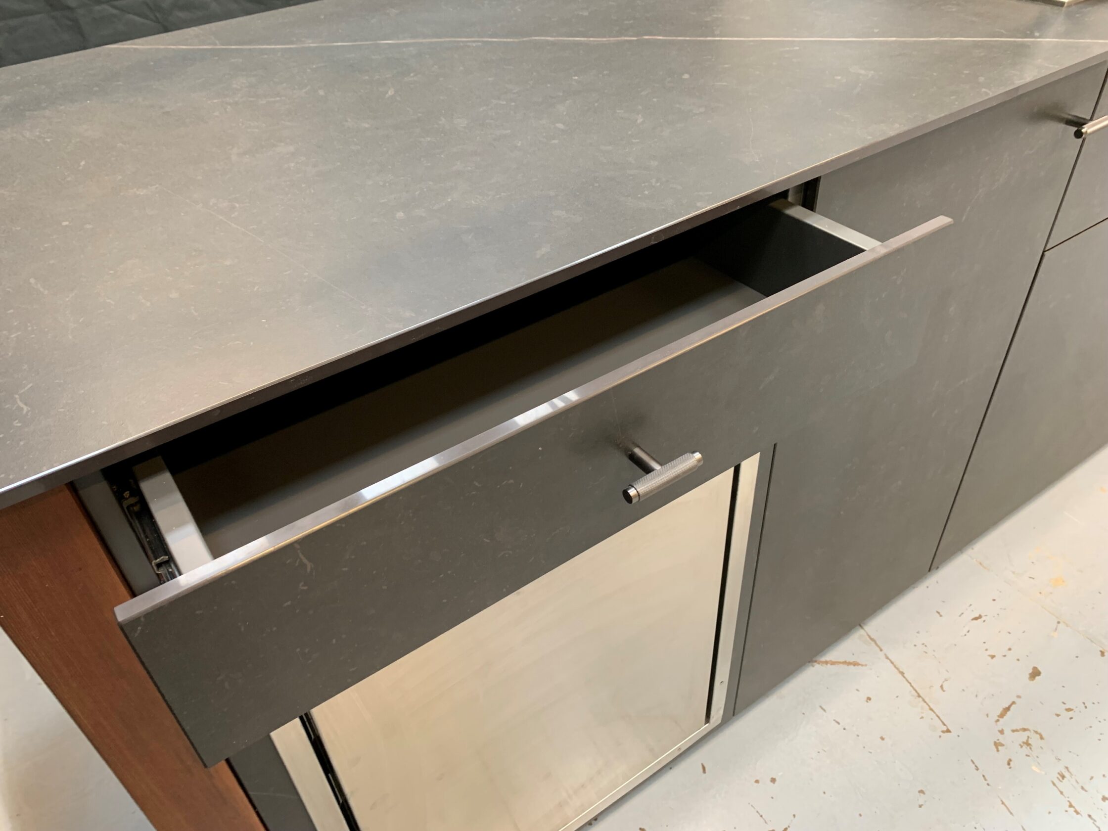 The external surfaces of the cabinetry are made from Neolith Calatorao, with natural highlights from the cedar wood end panels.